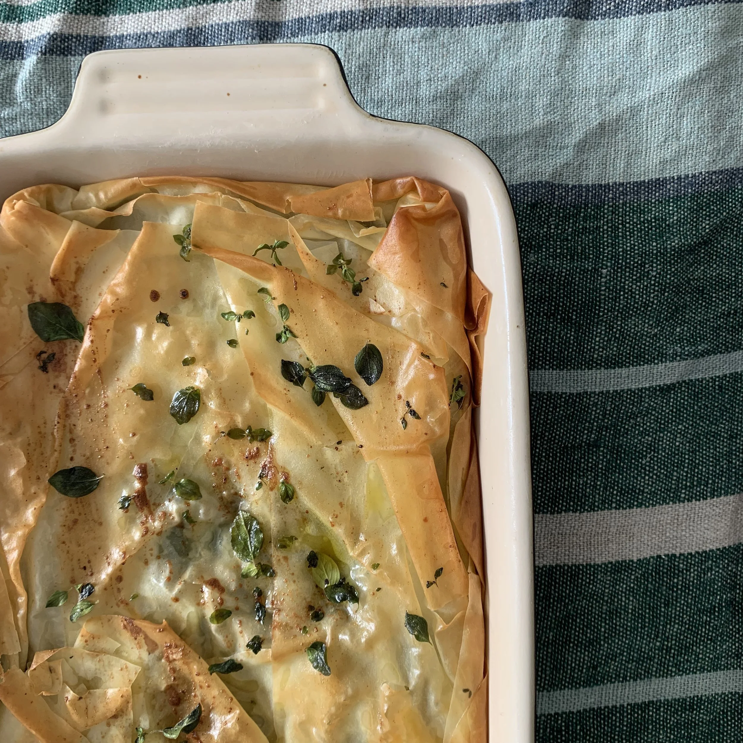 Once you feel like you’ve got a good base layer, fill the filo lined tray with your filling, patting it down gently, trying not to release too much moisture. Then, fold in the sides of the filo pastry and create a lid with a few more folded up pieces of pastry . Brush the lid with more olive oil and scatter with some remaining chopped herbs.